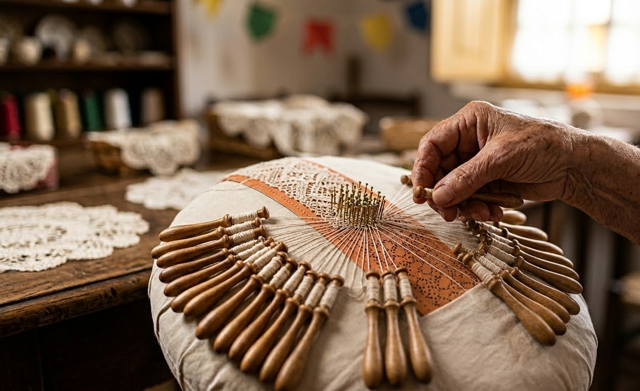 Renda de Bilro: O estalar das madeiras (bilros) nas almofadas das rendeiras produz tramas delicadas que são o DNA da cultura açoriana.